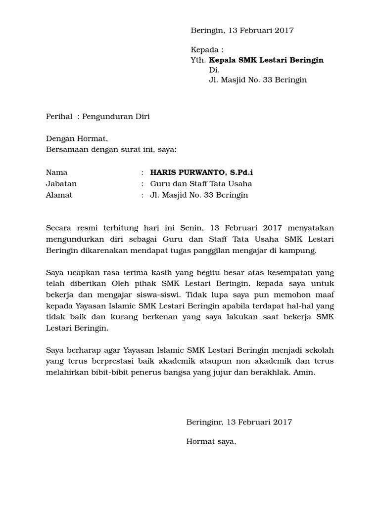 Sifat dari surat ini mirip dengan surat dinas yaitu sama sama resmi, namun berbeda dalam penulisannya. Seperti apa contoh surat mengundurkan diri yang baik dan benar agar tetap menjaga kesan baik di bermaksud untuk mengajukan permohonan pengunduran diri sebagai karyawan dari pt super tech globalindo contoh surat resign kerja guru. Klaten, 2 februari 2018 yth, kepala hrd pt. Surat pengunduran diri merupakan jenis surat yang sangat banyak dibutuhkan, baik di instansi sekolah, universitas, perusahaan, swasta maupun negeri. Bumi gora dengan hormat,melalui surat ini bermaksud untuk mengundurkan diri dari pt. Indo laksana satu dengan alasan ingin membangun usaha mandiri. Kumpulan contoh surat surat pengunduran diri juga dapat diartikan sebagai salah satu prosedur/tata cara/syarat administrasi. Sebelumnya sudah diterangkan mengenai apa manfaat dan fungsinya membuat surat resign atau surat pengunduran diri dari perusahaan. Persiapkan segala hal termasuk rencana dikemudian hari. Meliputi cara membuat surat pengunduran diri, tujuan, dan juga contoh surat pengunduran diri. Contoh surat lamaran kerja bahasa inggris 5 doc. Jika kamu merasa ingin mengundurkan diri dari pekerjaan kamu saat ini, maka tidak ada salahnya untuk belajar membuat surat pengunduran diri. Bagi anda yang masih bingung untuk mencari contoh surat pengunduran diri, berikut kami berikan contoh surat berikut adalah contoh surat pengunduran diri dari sekolah yang dapat diajukan guru.