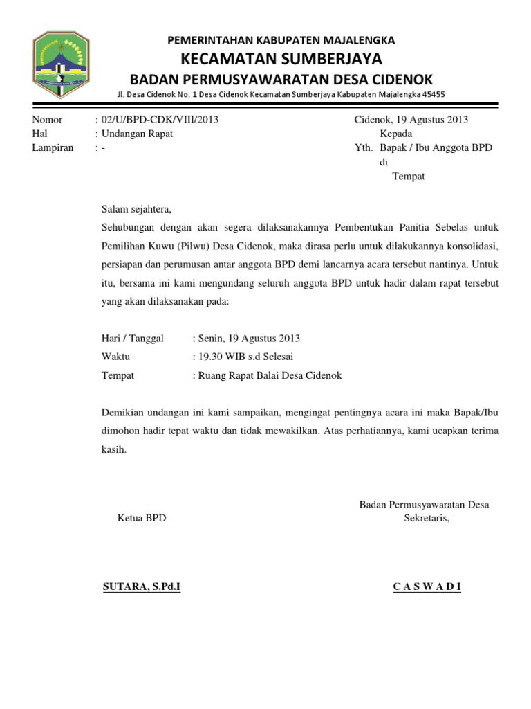 18 Contoh Surat Undangan Rapat Resmi Terbaru Terlengkap 2021 from suratku.id 003 22 423 302 04 2018 sifat. 20 contoh surat undangan resmi dari berbagai instansi … Koleksi admin mengenai contoh surat undangan rapat musyawarah desa. Contoh undangan musrenbang desa pigura. Contoh surat undangan musyawarah masyarakat desa mmd miegames contoh undangan pembentukan panitia hut ri … Undangan resmi contoh surat undangan rapat musyawarah desa surat undangan rapat desa docx format surat undangan rapat persetujuan rancangan perdes … Undangan resmi contoh surat undangan rapat musyawarah desa surat undangan rapat desa docx format surat undangan rapat persetujuan rancangan perdes … Inilah pembahasan selengkapnya mengenai contoh surat undangan rapat musyawarah desa word.